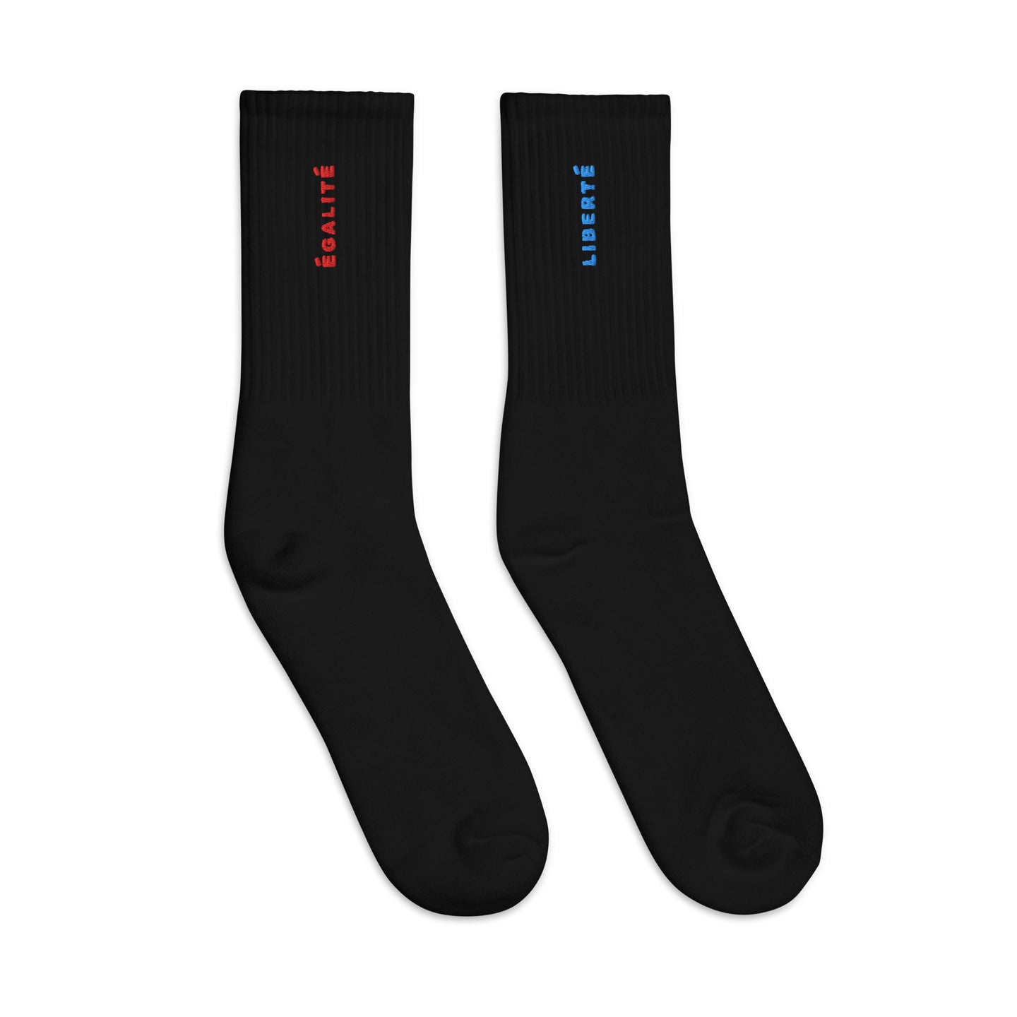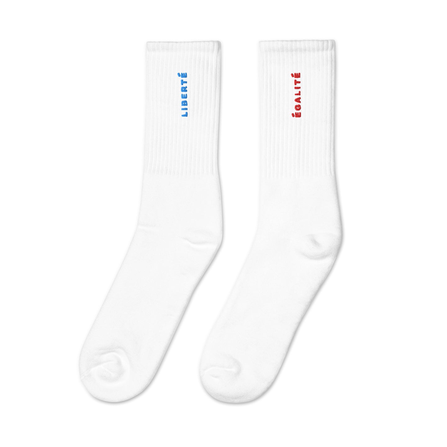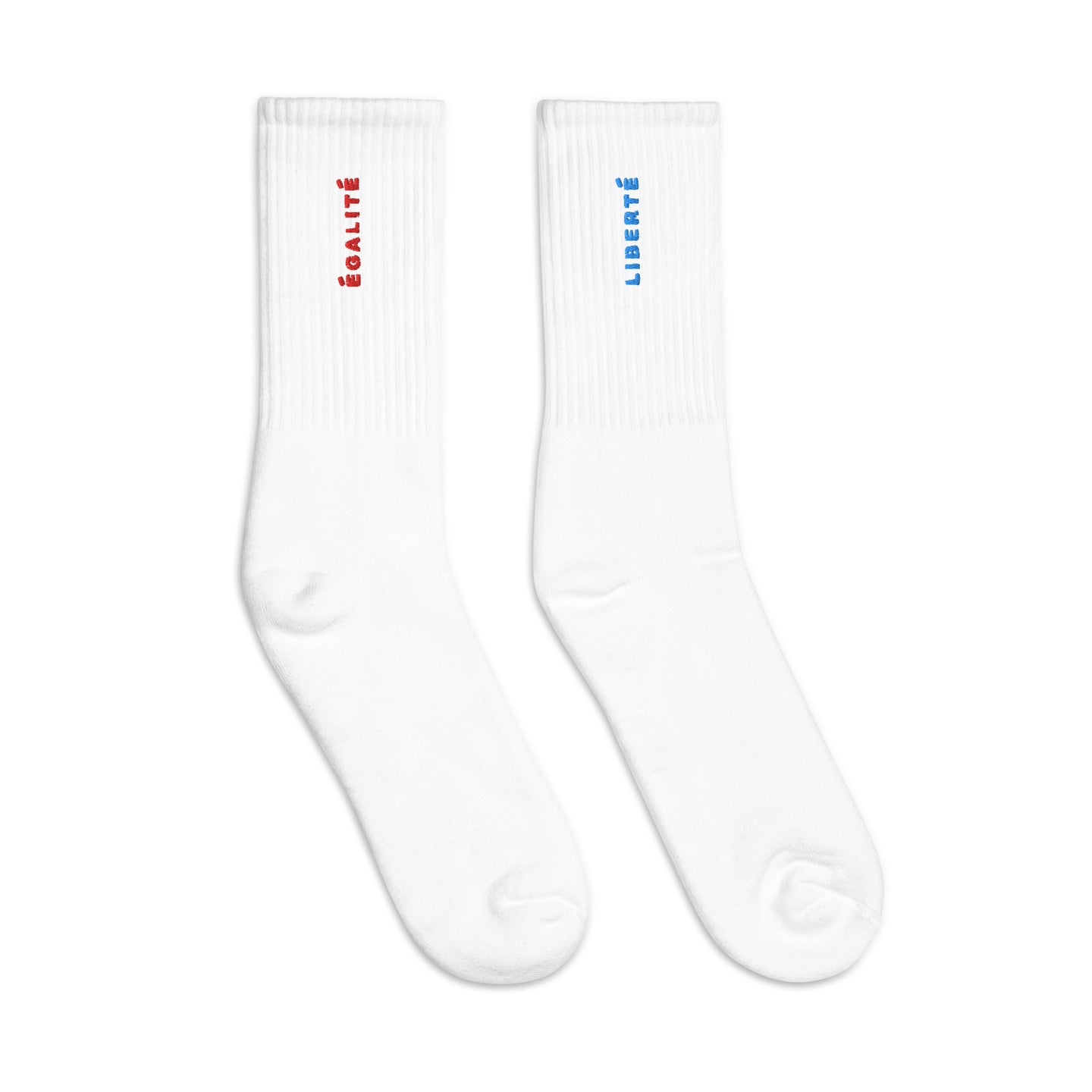 One sock is embroidered with Liberté in blue, and one sock is embroidered with Égalité in red.